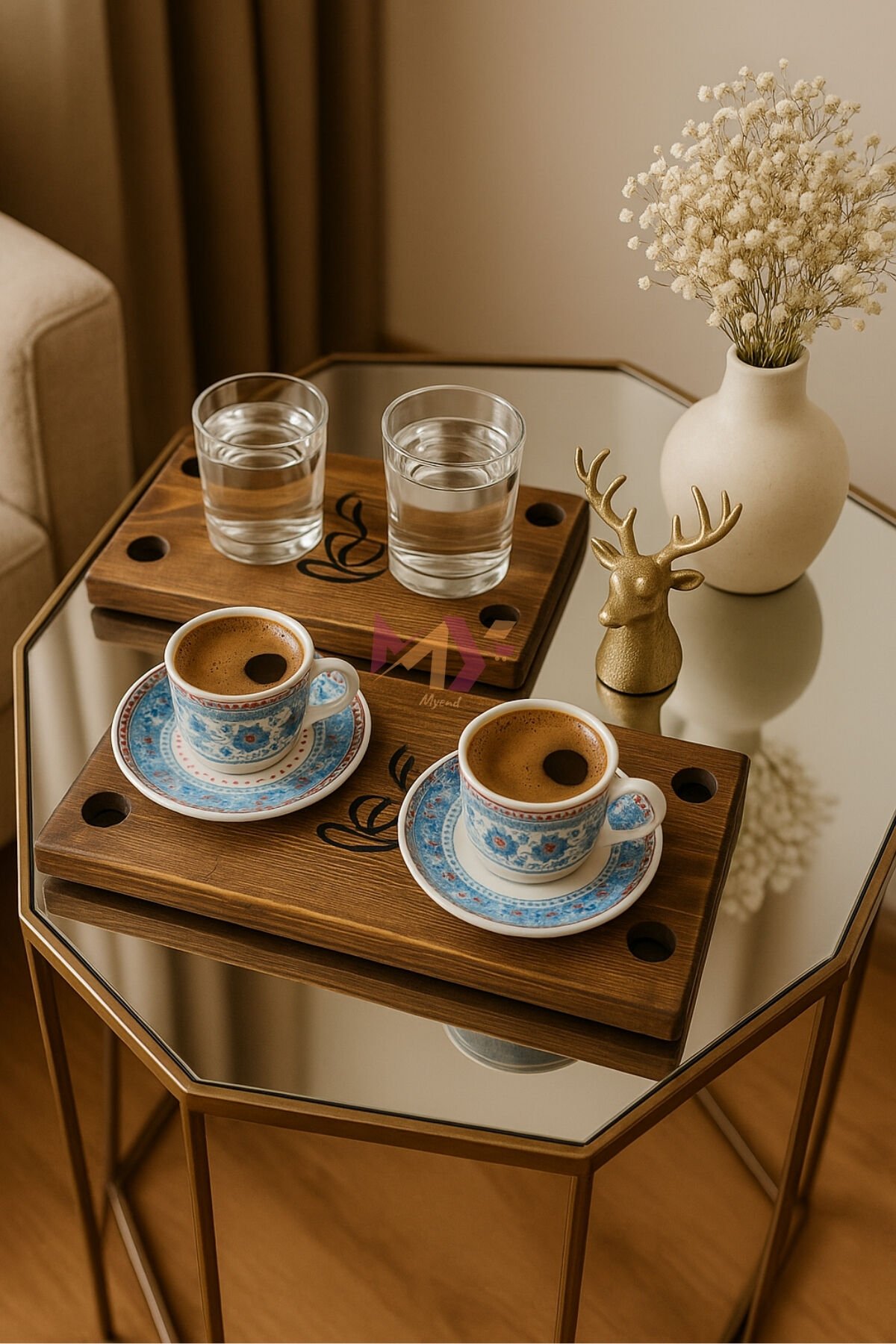 Üzerine Türk kahvesi fincanı, cam su bardağı ve küçük bir çikolata ekleyerek hem kendiniz hem de misafirleriniz için harika sunumlar hazırlayabilirsiniz.